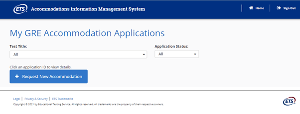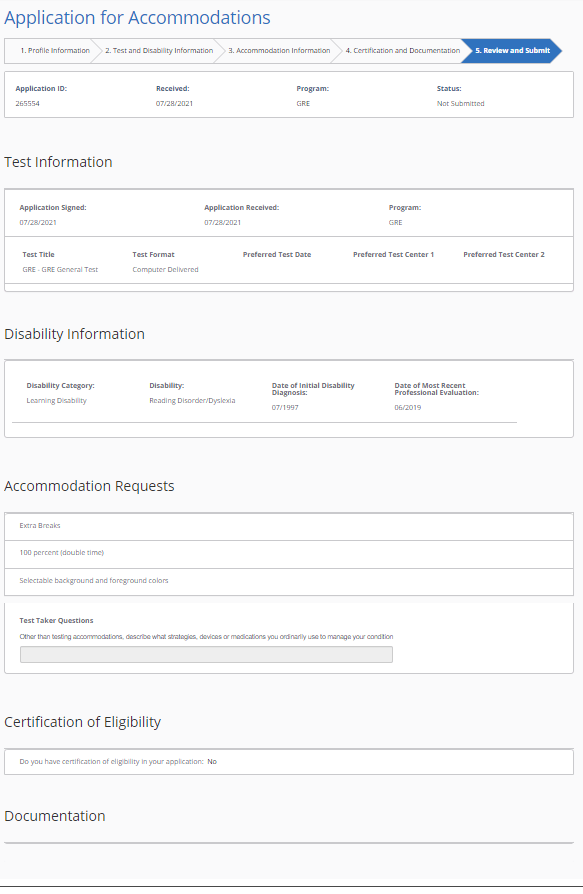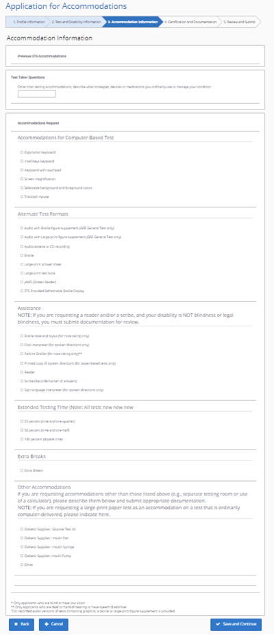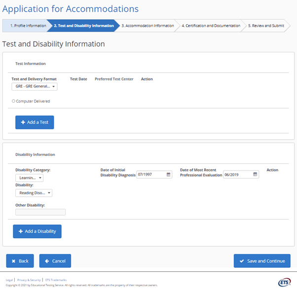 - On the next page you will specify that you are applying for the GRE and fill in information about all disabilities and dates of first diagnosis and most recent evaluation.