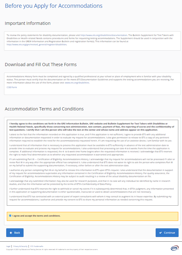 - The next page asks you to specify what accommodations you require. Remember that there are restrictions on what can be requested if you are submitting only a certificate of eligibility.
